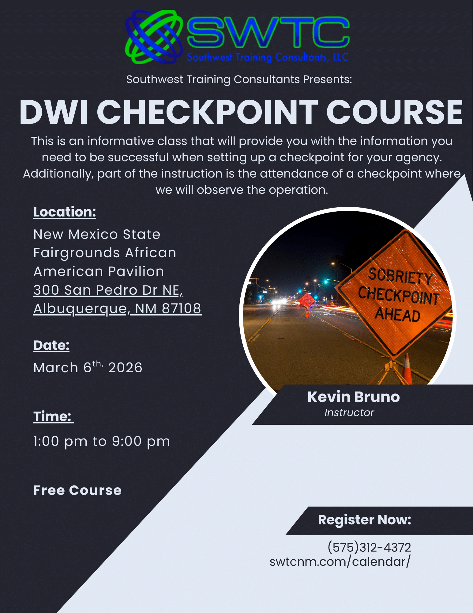 Description: This course is designed to refresh the general instructor. We will discuss some of the basics and some new ideas. This is a state-accredited course that is required every four years. Date: January 5th, 2026 Location: New Mexico State University Police Department, 725 College Pl, Las Cruces, NM 88005 Course Cost: $150.00 per attendee Description: This is an Instructor course, the requirement to attend is you must be a certified LE Officer and have attended a General Instructor Certification course. During this block of […] Description: During this block of instruction, we will review the basics of identifying the generalities of an FTO program, how the program is set up, and the responsibilities of the […] Description: This course will equip you with the essential skills to become an effective Supervisor, Leader, and Manager. Every employee is unique; this course will present various techniques to approach […] Description: This week-long class will give you the foundation to become a professional and dynamic instructor. You will learn how to develop your own curriculum, how to get it accredited, […] Description: This week-long class will give you the foundation to become a professional and dynamic instructor. You will learn how to develop your own curriculum, how to get it accredited, […] Description: The DWI Checkpoint class is an eight-hour block of instruction that goes over all the parameters related to conducting a checkpoint. We will review case law in detail, as […] Description: This weeklong course is designed to get you prepared for the instruction of the Standardized Field Sobriety tests. As an attendee in this class we will go over with […]