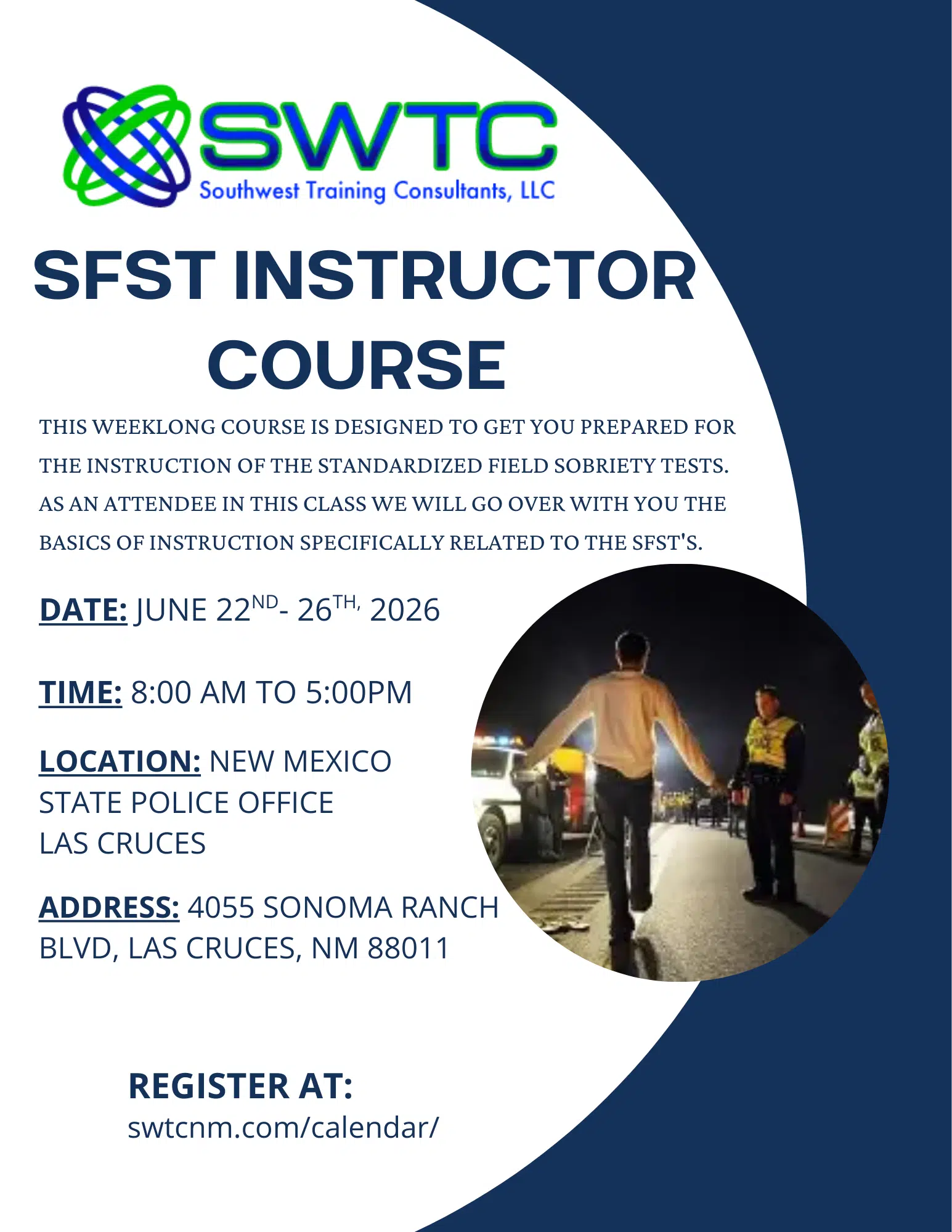 Description: This weeklong course is designed to get you prepared for the instruction of the Standardized Field Sobriety tests. As an attendee in this class we will go over with you the basics of instruction specifically related to the SFST's. There are a couple of requirements for this course. First, you must be able to […]