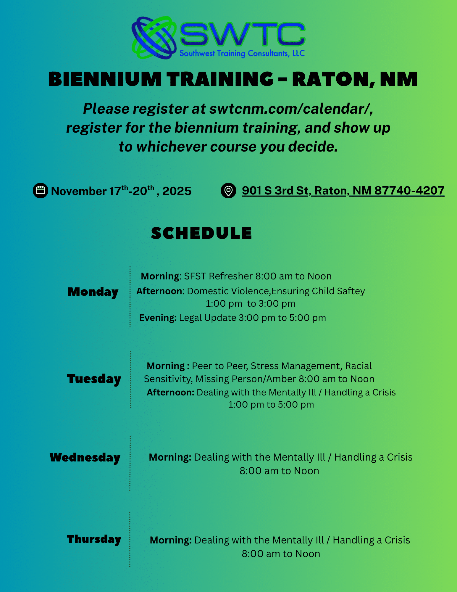 When: November 17th-20th, 2025 Where: 901 S 3rd St, Raton, NM 87740-4207